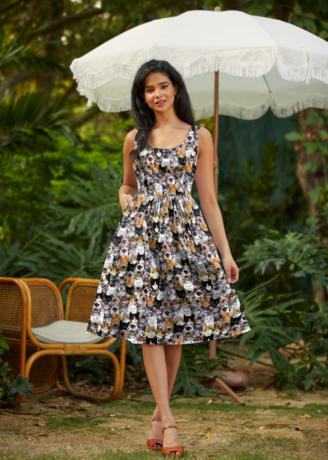 Retro-Kleid mit ausgestelltem Rock und realistischen Katzenmotiven