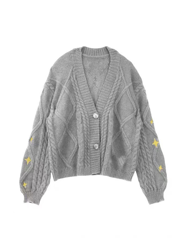 Star Embroidered Print Cable Knit V Neck Cardigan
