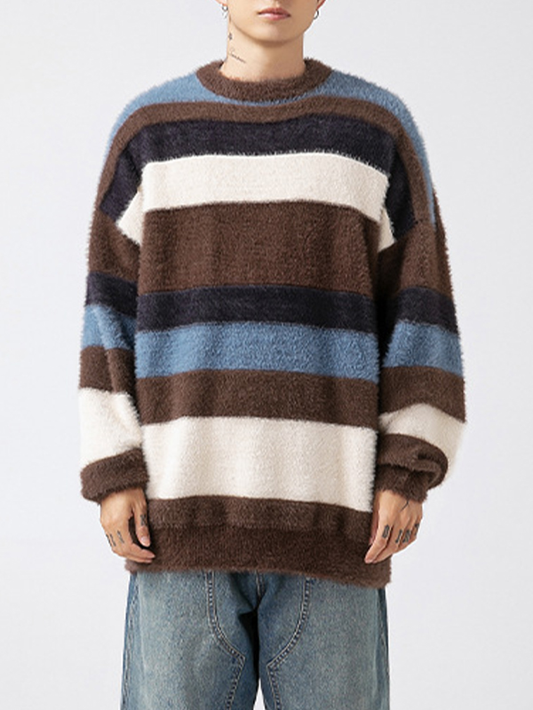 Faux Mink Contrast Striped Crew Neck Sweater