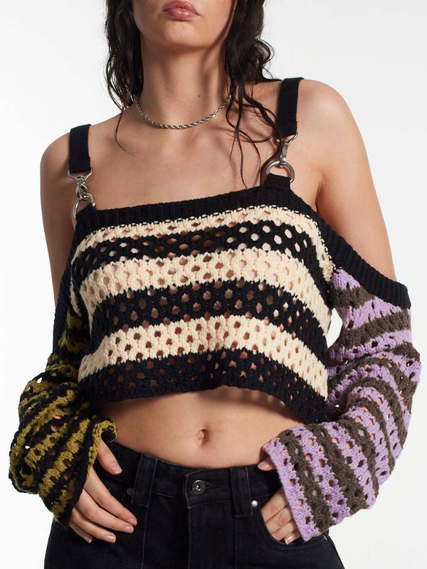 Cutout Contrast Color Splice Buckle Strap Crochet Top
