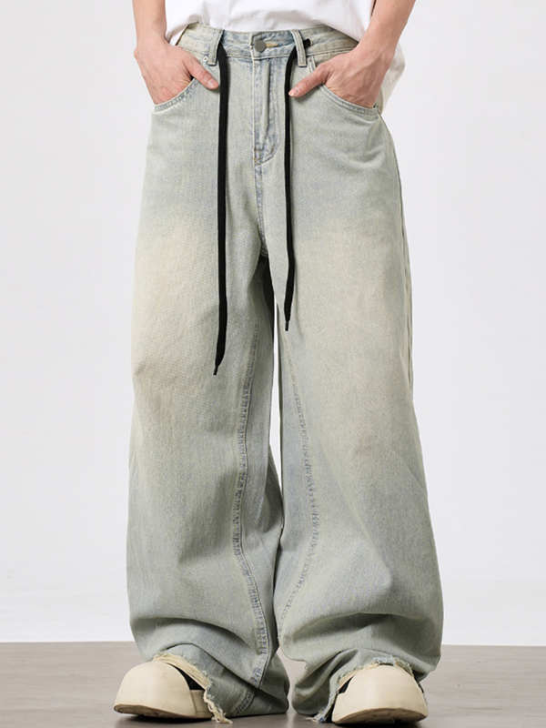 Men’s Coconut Tree Embroidery Print Drawstring Loose Jeans