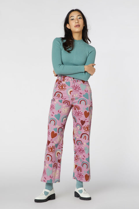 Lass dich von der „I Love Rainbows“-Jeans in eine kaleidoskopische Welt entführen, wo handgemalte Herzen, wache Augen und leuchtende Regenbögen in einem unwiderstehlichen Print verschmelzen, der deine Liebe zu allem Strahlenden und Schönen zum Ausdruck bringt. Diese Jeans aus mittelschwerem Baumwolltwill bietet Komfort, ohne dabei auf Stil zu verzichten. Der hohe Bund schmiegt sich perfekt an deine Figur an, und das gerade Bein weckt die Abenteuerlust. Mit Seitentaschen für deine Geheimnisse und aufgesetzten Gesäßtaschen für alles andere ist sie ebenso funktional wie fantasievoll. Schlüpfen Sie in diese Teile und zeigen Sie selbstbewusst, dass Ihre Garderobe eine Leinwand ist, bemalt mit der Freude des Regenbogens.