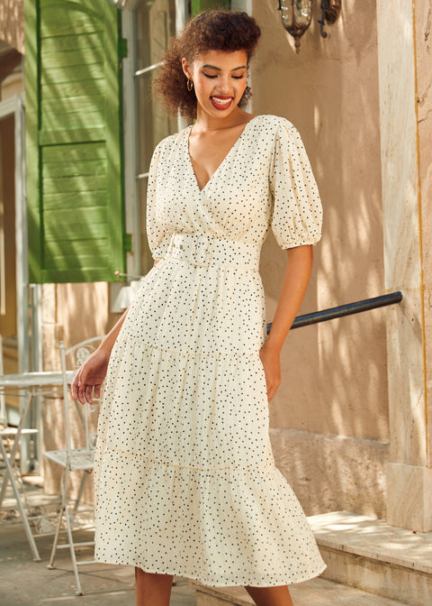 Anmutig, nostalgisch und mühelos romantisch – das Kleid „Lillian Pearl“ von ModCloth ist ein Juwel der Eigenmarke, inspiriert vom sanften Glamour der 1930er-Jahre. Mit seinem Wickelausschnitt, den voluminösen Ballonärmeln und dem fließenden Stufenrock in Midi-Länge lässt dieses Kleid Vintage-Träume wahr werden. Ob Sie nun gemütlich auf der Veranda Tee trinken oder sich unter Lichterketten drehen – der weiche Fall und die zeitlose Silhouette machen dieses Kleid zu einem Schmuckstück, das Sie für immer lieben werden.
