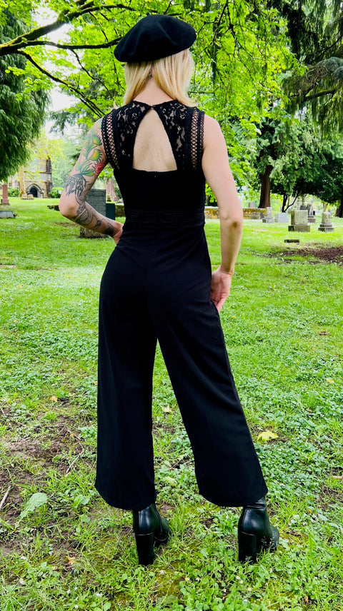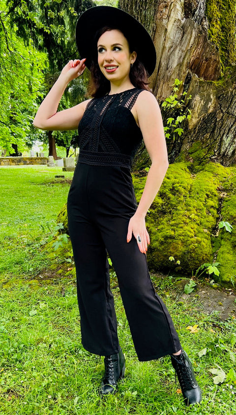 Kraft, Eleganz und ein Hauch von Geheimnis – der Branwen Jumpsuit ist die düster-schicke Antwort auf Ihre Träume vom Business-Gothic. Dieser Jumpsuit ist eine moderne Interpretation unseres beliebten Agatha-Kleides und besticht durch eine betonte Taille, ein weites Bein und – ja – Taschen, denn Hexen meinen es ernst. Das mit Spitze besetzte Oberteil verleiht ihm einen Hauch romantischer Rebellion, während der Rückenausschnitt genau die richtige Portion Geheimnis für Meetings oder Ausritte auf dem Besen bietet. Strukturiert und bezaubernd zugleich.