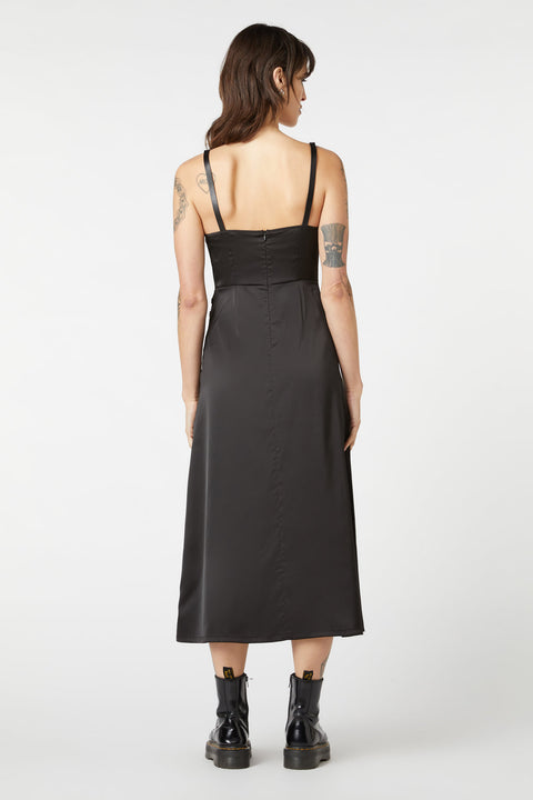 Verbringen Sie stilvolle Eleganz mit diesem schwarzen Kleid von Dangerfield. Das Kleid besticht durch ein figurbetontes Oberteil, das Ihre Kurven elegant umspielt, während der ausgestellte Rock feminine Eleganz und fließende Bewegungen verleiht. Die verstellbaren Schulterträger sorgen für eine perfekte Passform, und der gewagte Schlitz an der Vorderseite verleiht dem Kleid genau die richtige Portion Verführung.