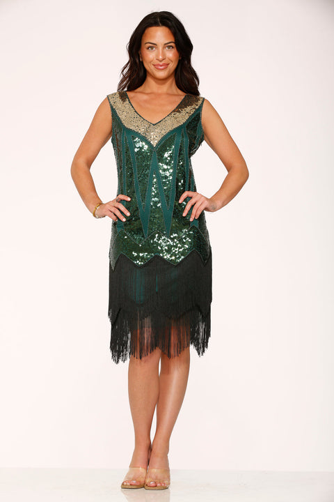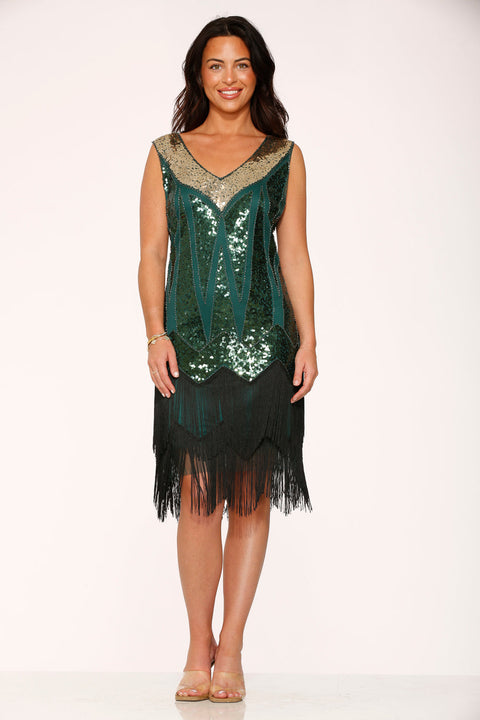 Erwecken Sie die Tanzfläche zum Leuchten in diesem strahlend smaragdgrünen Flapper-Kleid von Orchid Bloom. Mit schimmernden Pailletten, einem goldverzierten Ausschnitt und verspielten Fransen für fließende Bewegungen verleiht dieses Vintage-inspirierte Kleid jedem Fest einen Hauch von Gatsby-Glamour.