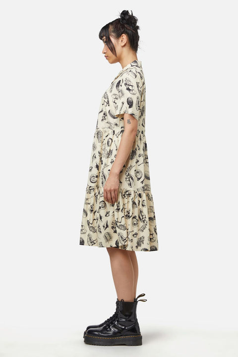 Dieses einzigartige Babydoll-Kleid vereint grafischen Flair mit mühelosem Tragekomfort. Mit dem exklusiven „Body Fossils“-Print, einem lässigen Oversized-Schnitt, T-Shirt-Ärmeln und einer Knopfleiste vorne entsteht ein entspannter und gleichzeitig trendiger Look. Das Kleid aus weicher Viskose ist perfekt für einfaches Styling und hohen Tragekomfort.