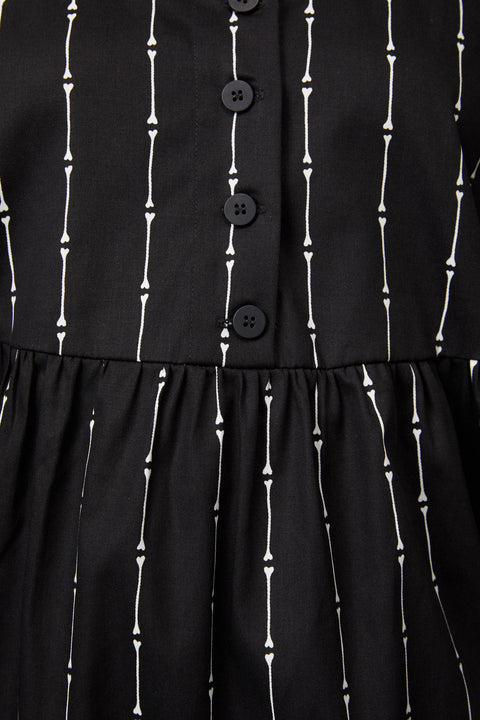 Mit dem Funny Bone Pinafore, einem von der Gothic-Mode inspirierten Kleidungsstück, das Ihrer Garderobe eine verspielte Note verleiht, kommen Sie in Halloween-Stimmung. Das lässig geschnittene Pinafore mit Allover-Nadelstreifenmuster aus Knochen kombiniert dunkle, kantige Vibes mit einem lustigen, skurrilen Design. Der ärmelloseStil und der Rundhalsausschnitt bieten vielseitige Kombinationsmöglichkeiten, während die Midi-Länge für eine schmeichelhafte und bequeme Silhouette sorgt.