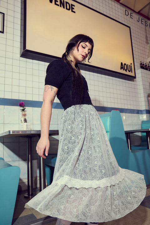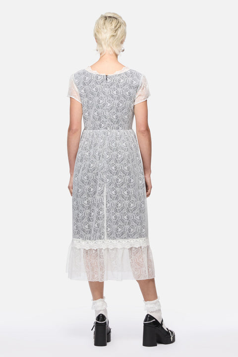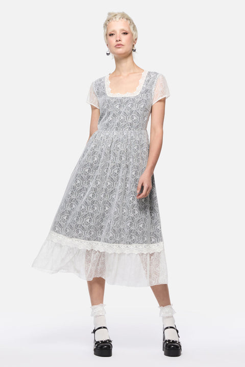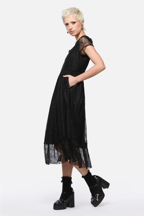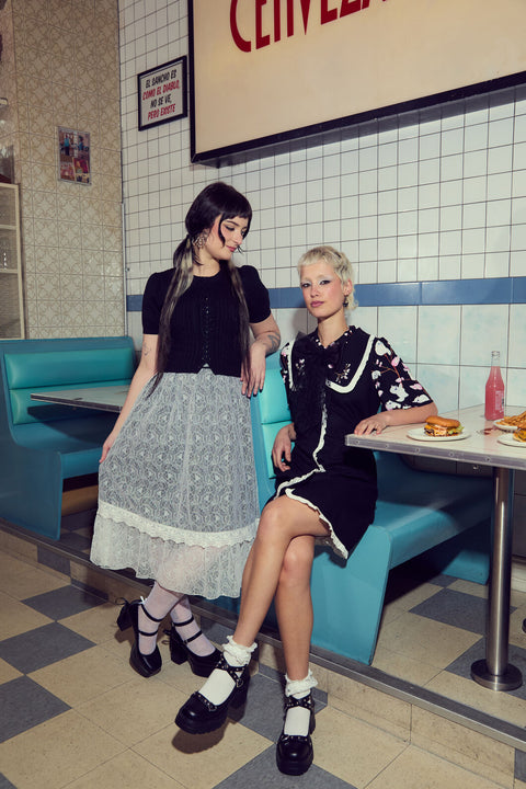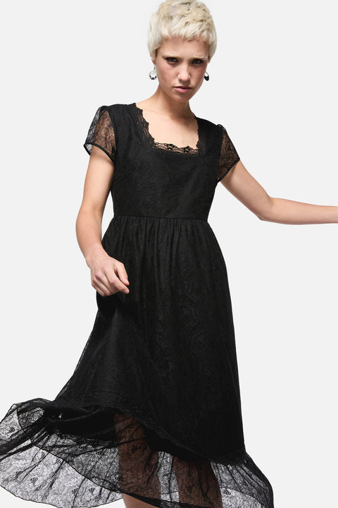 Kitschig, skurril und retro-inspiriert – dieses Gothic-Kleid im Vintage-Stil vereint Süße und Grusel mit seinem eckigen Ausschnitt und der zarten Spitzenborte. Perfekt für alle, die klassische Silhouetten mit einem Hauch von Dunkelheit lieben.