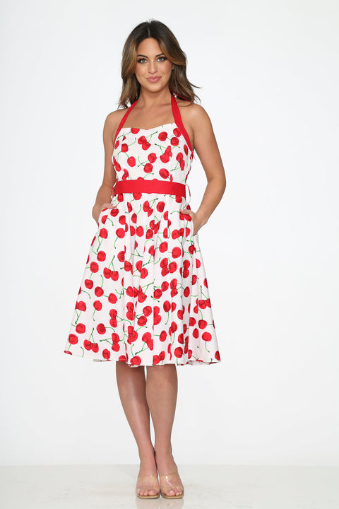 Das weiße, rot-kirschige Neckholder-Swingkleid von Orchid Bloom ist ein süßer und frecher Retro-Schönheitsmoment. Mit seinem klassischen Neckholder-Ausschnitt und dem kräftigen roten Kirschprint auf strahlend weißem Grund verleiht dieses Swingkleid warmen Tagen einen verspielten Pin-up-Charme. Gefertigt aus einer weichen Baumwoll-Elasthan-Mischung, bietet es genau die richtige Dehnbarkeit für eine schmeichelhafte Passform. Mit einem Reißverschluss hinten und praktischen Seitentaschen ist dieses Kleid ebenso funktional wie fabelhaft.