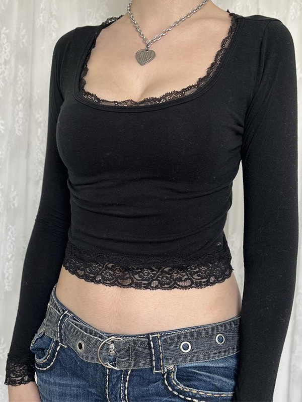 Lace Trim Splice Square Neck Crop Long Sleeve Tee
