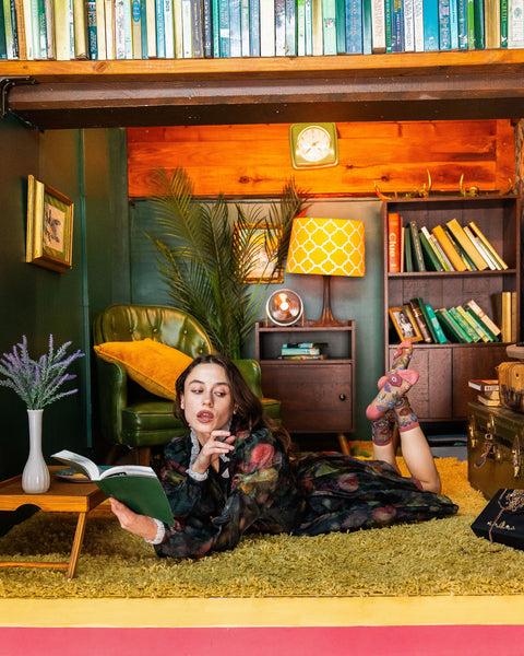 Romantisch, im Vintage-Stil und bezaubernd – unsere schwarze, transparente Socke mit dunklem Blumenmuster bringt geheimnisvolle Schönheit in Ihre Sockenschublade. Ein Meer aus Gartenblüten in zarten Lila-, Blau-, Salbeigrün- und Elfenbeintönen ziert den schwarzen, transparenten Stoff. Abgerundet wird das Design durch ein Bündchen, eine Ferse und eine Spitze in Altrosa für einen eleganten Touch.