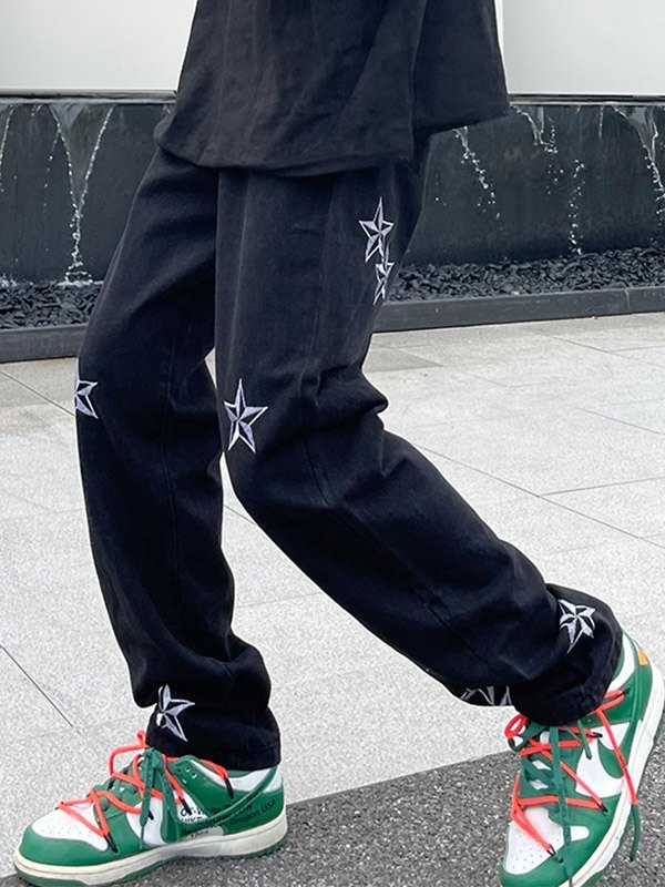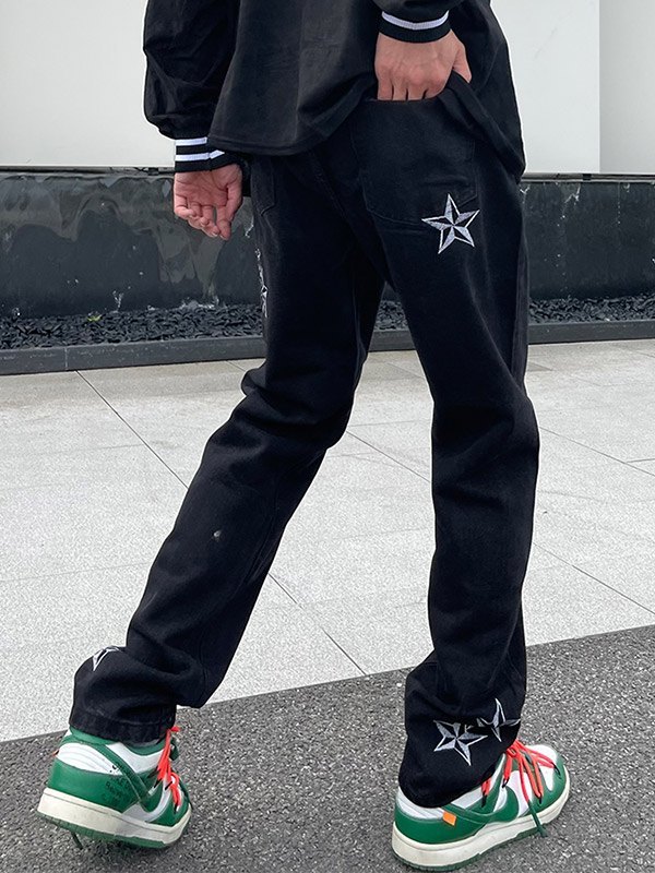 Description: These dark retro-inspired mens jeans shaped to a flattering cut, they have contrast star embroidered details through the leg, features multiple jeans pockets, and ended with a button zip fly.