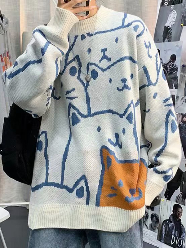 Men’s All Over Cartoon Cat Jacquard Crew Neck Sweater