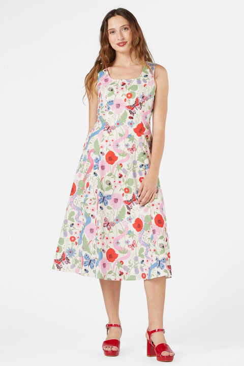 Cremefarbenes, ärmelloses Midikleid. Ein wunderschönes Printkleid, das das Jahr der Schlange begrüßt und mit Schlangen, Beeren, Schmetterlingen, Insekten und Blumen verziert ist.
