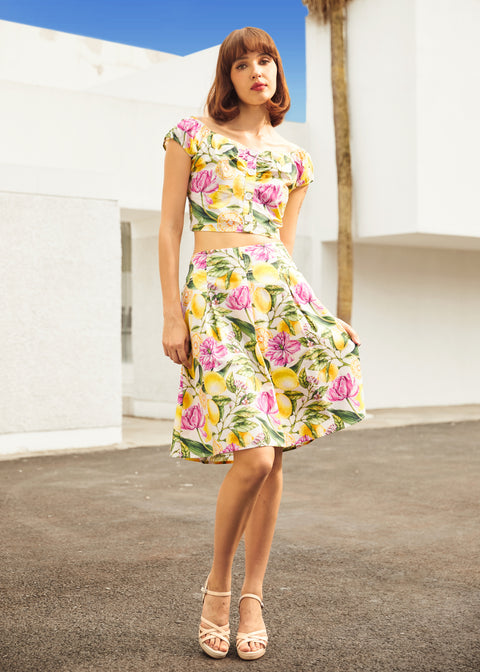 Das süße, strukturierte und sonnige Top „The Zest Is Yet to Come“ unserer ModCloth-Eigenmarke ist ein wahrgewordener Traum für alle Zitrusfans. Mit seinem auffälligen Zitronenblumenmuster besticht dieses kurze Top durch kurze Ärmel, einen herzförmigen Ausschnitt und eine Knopfleiste. Der geraffte Rücken sorgt für eine bequeme und flexible Passform – perfekt zum passenden Rock oder solo für einen frischen Retro-Look.